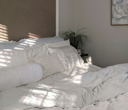 Lin har et naturlig, rustikt uttrykk og en lett struktur som gir et avslappet utseende. Det er temperaturregulerende og blir mykere med tiden. Perfekt for deg som ønsker et avslappet, men stilrent soverom.